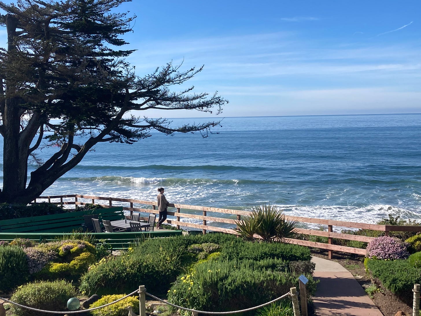 For a week, I live at the edge of the Pacific ocean. The Villa Maria Del Mar retreat center overlooks Monterey Bay. My room is south facing with a view over the water. I open the window first thing and close it as my last act before heading home. All night the waves rise and fold and fall. They lap me, rock me, hold me.