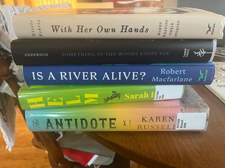 In the meantime, I should be doing some handwork. I’ve got plenty of projects going, and I did manage to finish most of one sock for my partner. There is, of course, the other one left to knit. But right now, reading one word after the other is more appealing than knitting stitch after stitch. All my library holds appeared, as they often do, at the same time. I’m working my way through the most appealing ones and returning a few with some questions as to why I requested them to begin with.