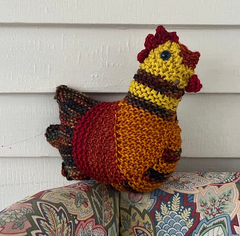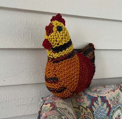 You can learn more about the Emotional Support Chicken here (I knit the Junior version).