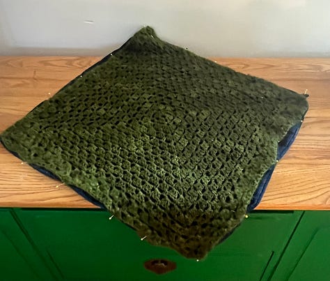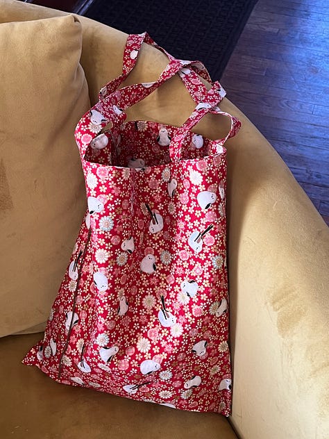 Much sewing has happened since my last newsletter! I made a bag from some Japanese quilting fabric I purchased the last time I visited my daughter at college. I modeled the bag on one my daughter’s friend had made and gifted her. That bag was the perfect size, not too big, straps not too long, and with a lining. I added an internal pocket for knitting paraphernalia, needles, small sewing scissors, thread. I have also completed the pocket portion of another pillow for my partner’s apartment (alliteration anyone?). I need to attach the crocheted cover (also, by me) to one side of the pillow case. I’ll sew that by hand. And finally, I cut out the fabric for a short sleeve top, I plan to sew for myself. I haven’t made a garment in a couple of years. This is a simple pattern with a few nice finishing details to keep my interest and stretch my disused sewing muscles. I am much more interested in product than process when I sew, so I remind myself to slow down and enjoy the stitches as I create them. I practice finding pleasure in patience.
